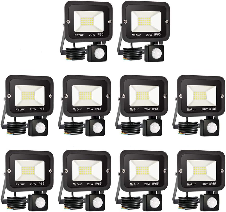 bapro 10 x 20W Projecteur LED détecteur de mouvement, Blanc Froid 6000K spot led exterieur avec detecteur IP65 lampe de sécurité idéal pour éclairage public, garage, couloir, jardin