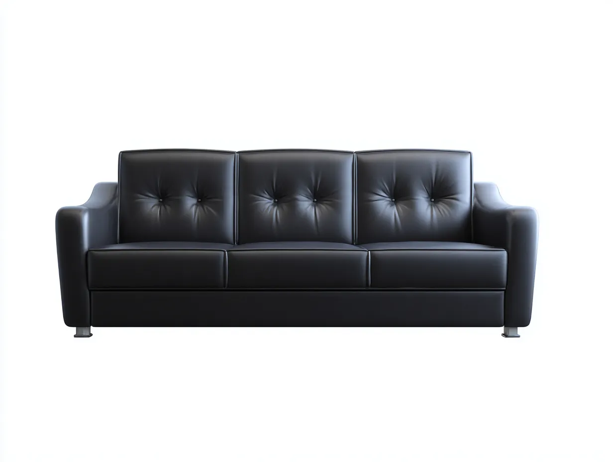 Le canapé est revêtu de cuir lisse de couleur noire, avec un capitonnage discret sur le dossier. Les finitions sont soignées afin d'assurer une bonne tenue dans le temps et une intégration harmonieuse dans différents styles d'intérieur.