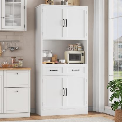 HOCSOK Buffet Haut Cuisine, 180 cm Armoire Cuisine avec 4 Portes et 2 Tiroirs, Meuble de Rangement avec Etagères Réglables, Vaisselier Vitrine, Blanc