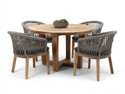 Salon de jardin repas en bois avec table ronde et 4 fauteuils 120x120x75 cm - naturel-gris - design contemporain