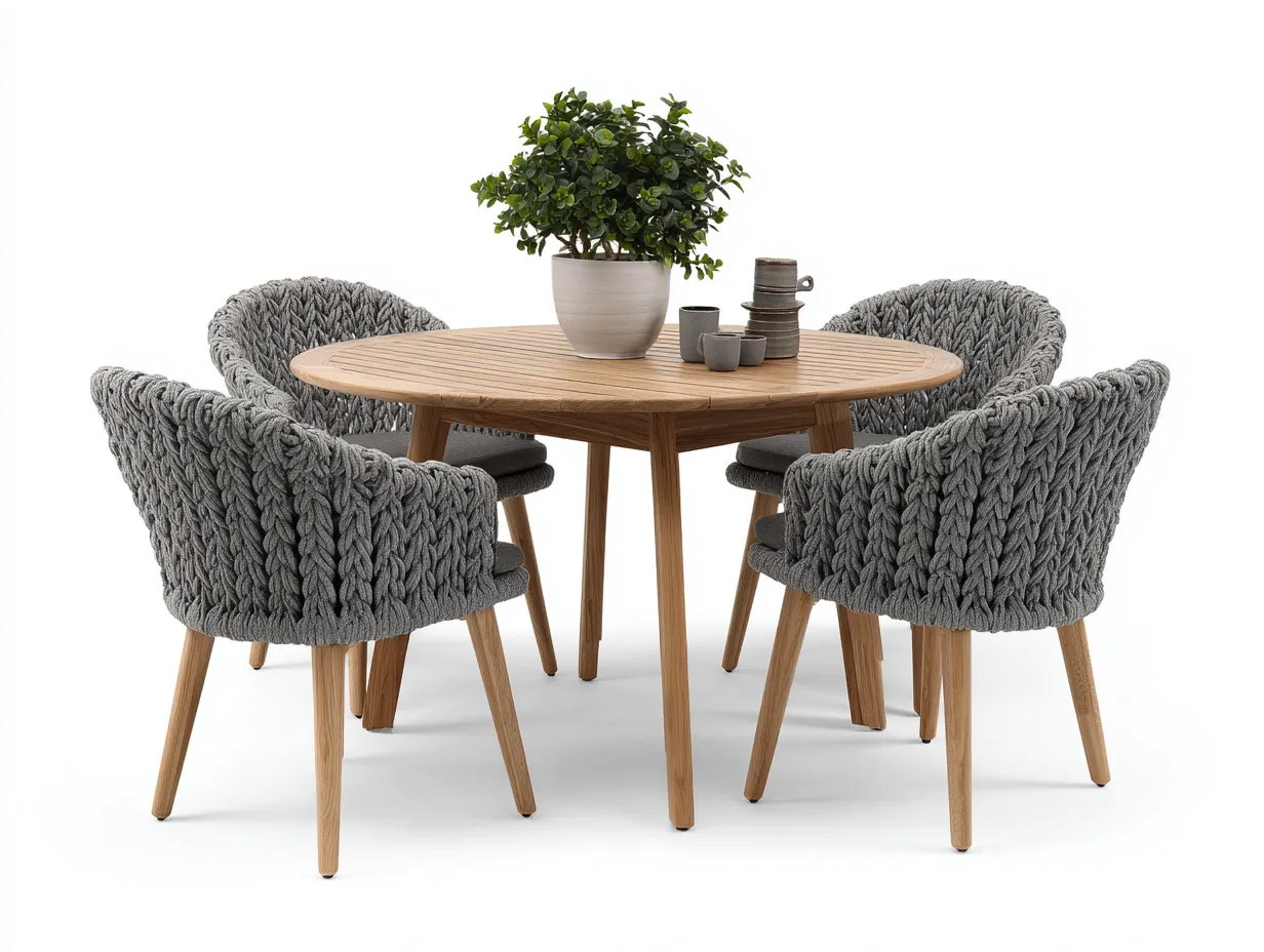 La table ronde favorise les échanges et optimise l'espace disponible. Les fauteuils enveloppants procurent un maintien confortable pour les repas et les moments de détente en extérieur.